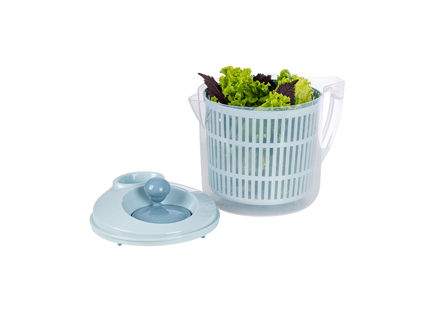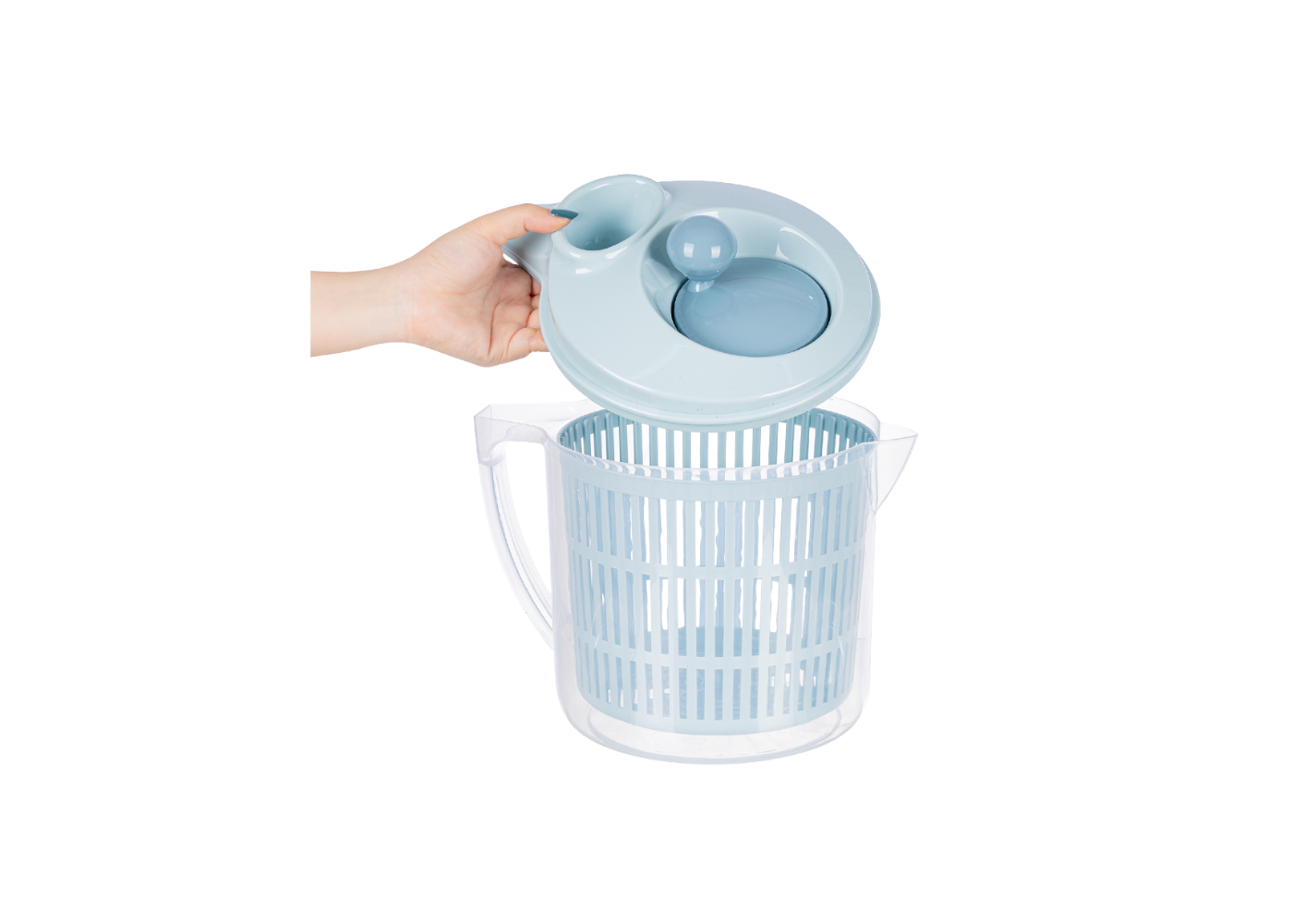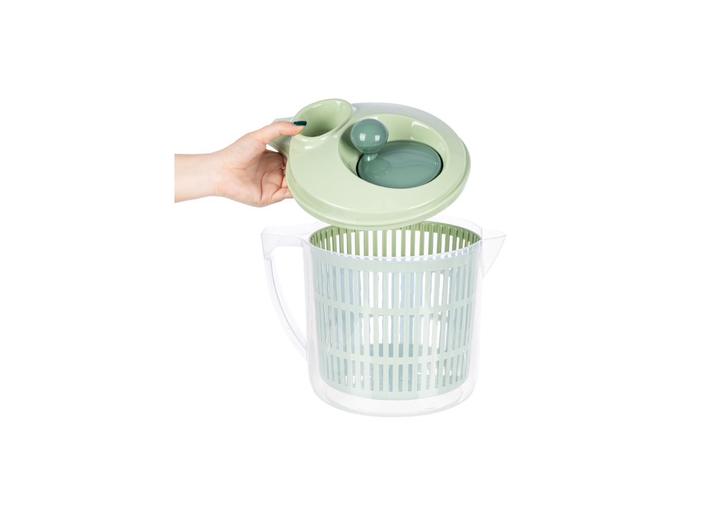 Sản phẩm hoạt động dựa trên nguyên lý lực ly tâm, khi quay, nước sẽ bị đẩy ra ngoài chậu chứa trong suốt, giúp thực phẩm khô ráo hiệu quả.